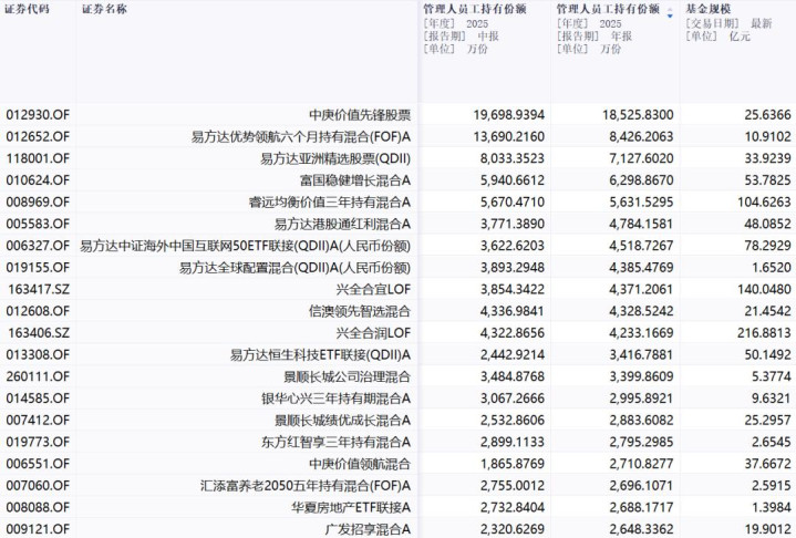 排在第一位的,是中庚价值先锋股票,内部员工持有1.85亿份额;然后是易方达优势领航六个月,员工持有8426万份额;易方达亚洲精选股票排在第三,员工持有7127万份额。