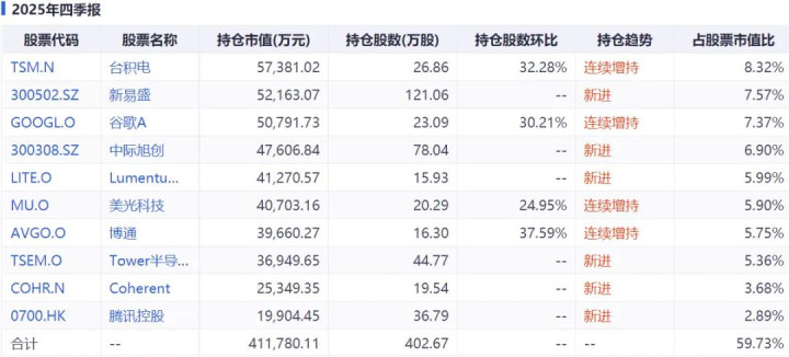他也曾在基金2025年的中期报告中明确提到,对AI算力产业链的看好是基于“大模型持续迭代将驱动AI基础设施需求持续增长”的判断。并在这个领域,多层次精选相关科技成长股,地区覆盖美股、A股、港股等。